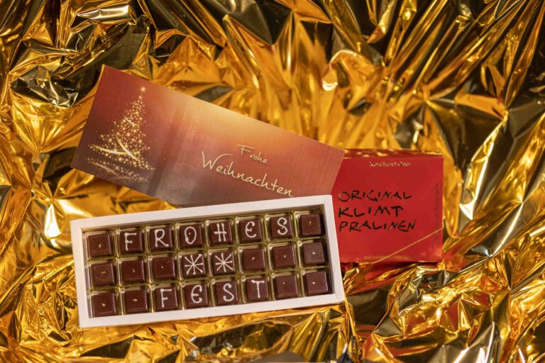 Edle Selection von: Orig. Klimtpralinen – Zartbitterpraline, gefüllt mit feinherber Amaretto-Ganaché, Blattgold Attersee-Klassik-Truffes – zartschmelzende Milchschokolade-Trüffel, gefüllt mit Bründlmayr-Rosé-Sekt-Ganaché Schloss Kammer Trüffel – weiße oder Milchschokolade-Trüffel, gefüllt mit Vanille-u. Nougat-Ganaché Wahlweise (je nach Packungsgröße) auch mit: Orig. Pfahlbau-Pralinen – zartbittere Schokolade mit fruchtigem Himbeermark, abgeschmeckt mit Himbeergeist in geröstetem Bio-Hanf Eierlikörtrüffel – weiße Schokolade mit…